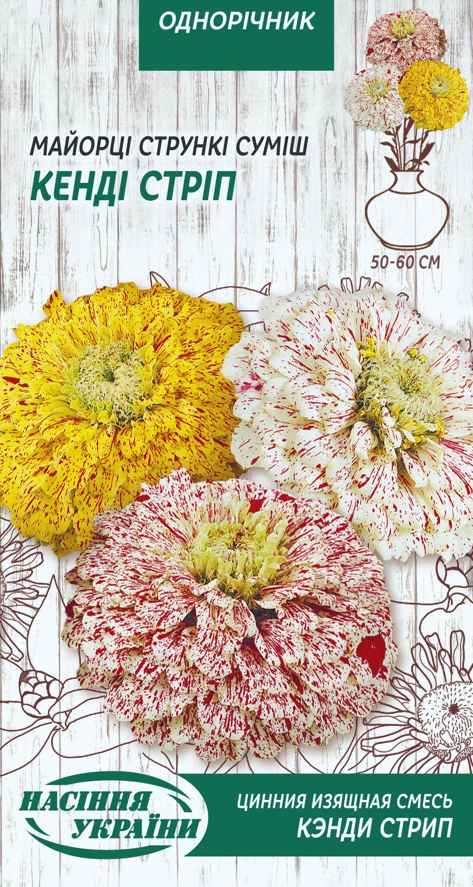 Однорічна рослина з міцними прямостоячими стеблами, висотою 50-60см. Суцвіття махрові, діаметром 6-7см, різноманітних забарвлень із смужками та крапинками. Використовується для оформлення клумб, квітників та зрізу в букети.