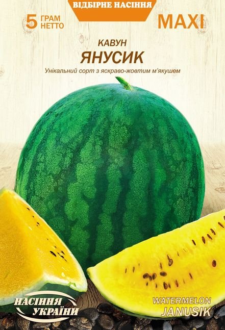Середньостиглий сорт. Період від сходів до початку стиглості 75-90 днів. Плоди середнього розміру, округло-овальної форми, вагою 3-5кг, темно-зеленого забарвлення зі світло-зеленими смугами. М’якуш жовтого кольору. Без ГМО.