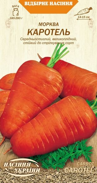 Середньостиглий сорт. Період від сходів до технічної стиглості 100-110 днів. Коренеплоди великі, конічної форми з тупим кінчиком, довжиною 14-15см, вагою 180-280г, оранжевого забарвлення. Без ГМО.