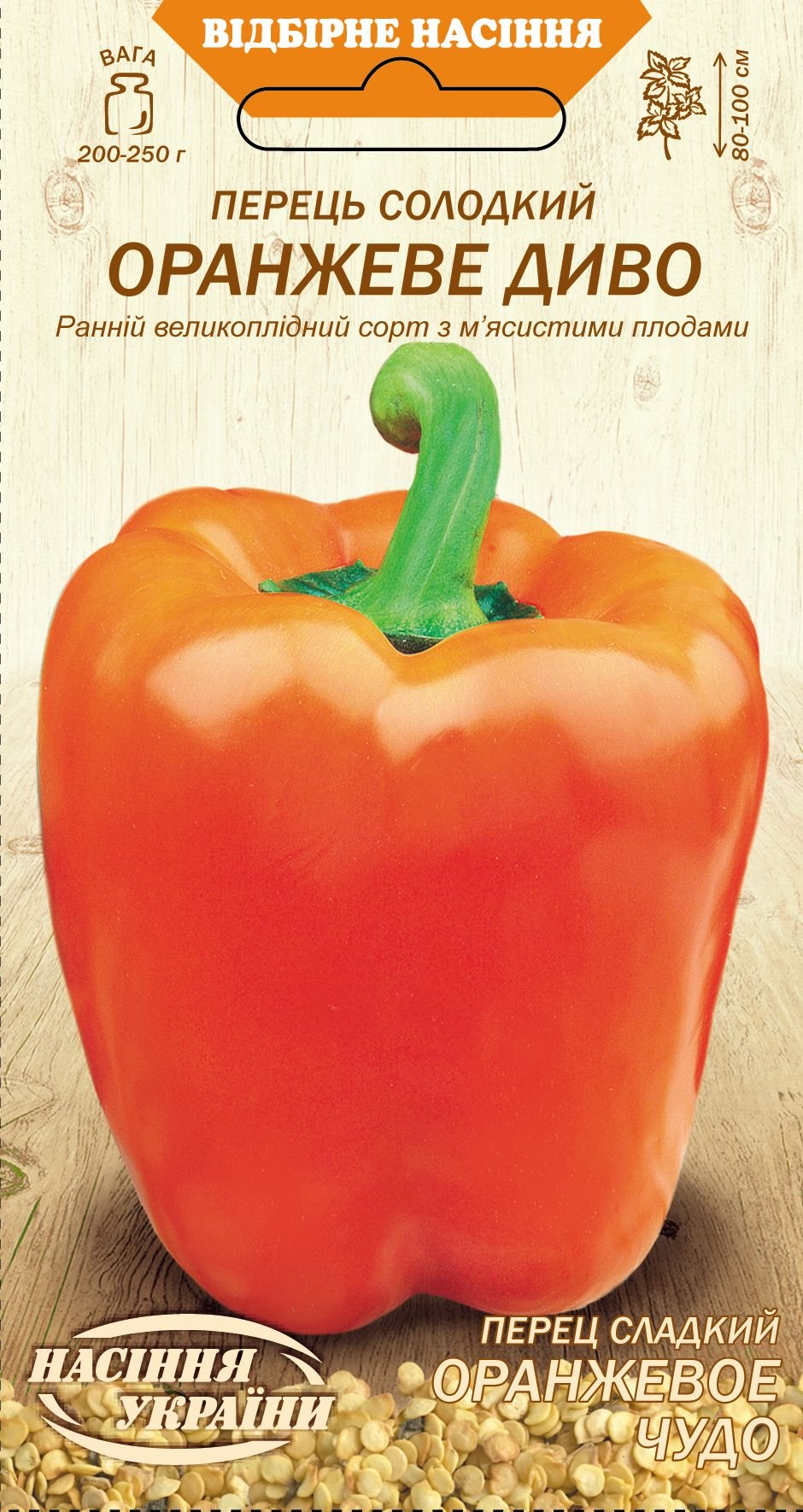 Ранньостиглий сорт. Період від сходів до початку стиглості 90-110 днів. Кущі висотою 80-100см. Плоди великі, кубовидної форми, вагою 200-250г, довжиною 10-11см, діаметром 9-10см, яскраво-помаранчевого забарвлення. Товщина стінок 5-10мм. Без ГМО.