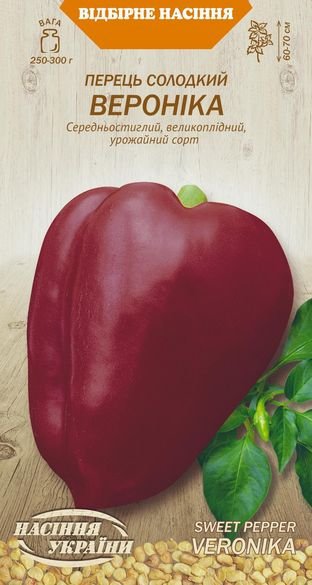 Середньостиглий сорт. Період від сходів до початку стиглості 130-140 днів. Кущі висотою 60-70см. Плоди великі, масою 300-400г, округло-конусоподібної форми, довжиною 12-15см, діаметром 8-9см, темно-вишневого забарвлення. Товщина стінок 8-9мм. Без ГМО.