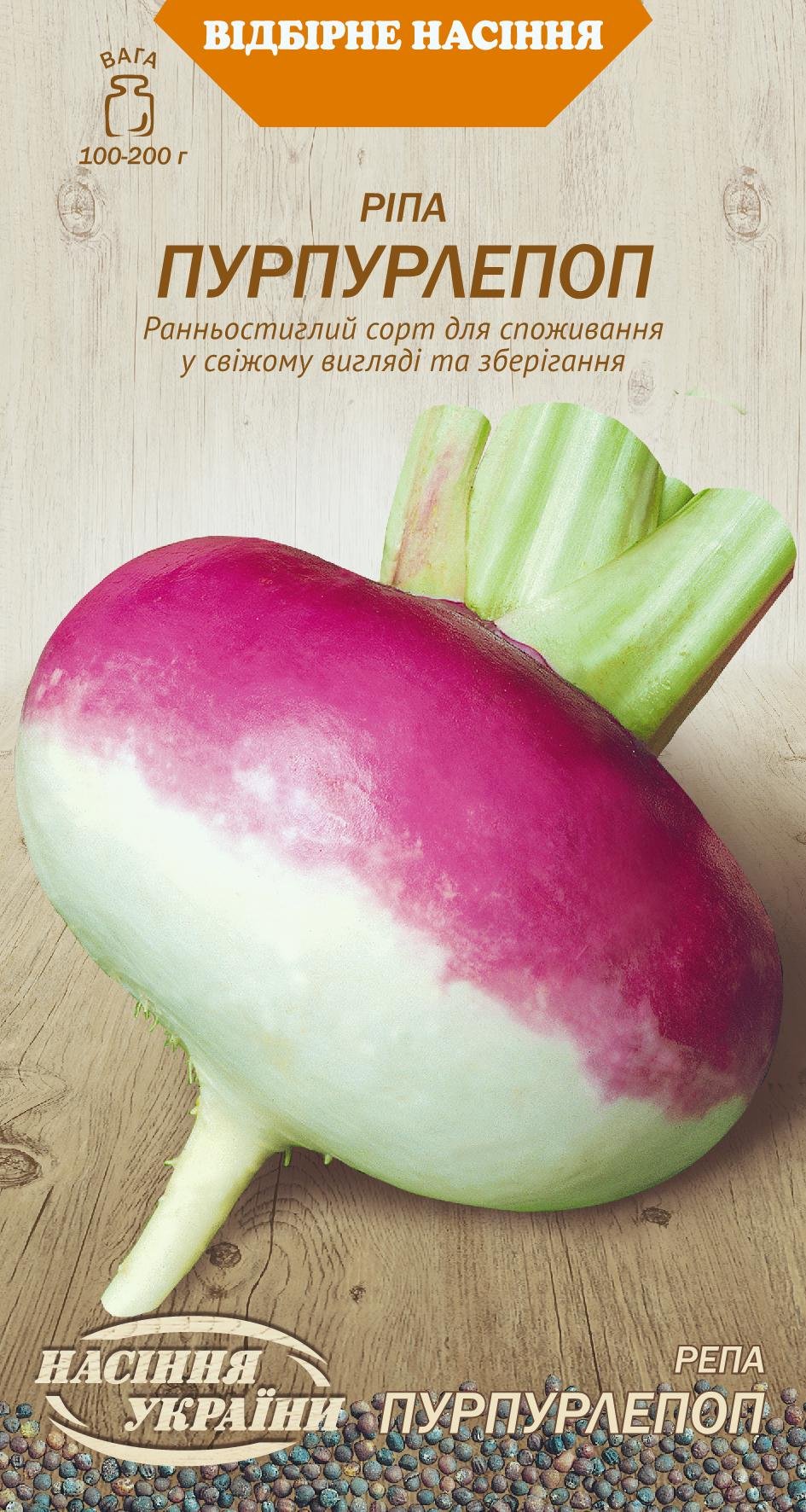 Ранньостиглий сорт. Період від сходів до перших зборів 40-45 днів, до технічної стиглості 60-70 днів. Коренеплоди середнього розміру, округло-плоскої форми, масою 100-200г, пурпурно-білого забарвлення. М'якуш білий. Без ГМО.